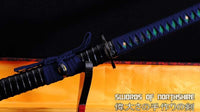 This is a well-made folded steel Katana, following the traditional Japanese process. The blade is very sharp and folded 13 times resulting in over 8,000 layers. It comes with a black lacquered hard wood saya and silk sageo/ito, iron fittings, and genuine same (rayskin). The tang is secured into the handle with two bamboo mekugi and features a hand engraved Mei(signature). It is a very good choice for Dojo students, gifts, cutting practice, and display. It is durable enough for cutting tameshigiri and bamboo. Each sword is individually handmade so specifications vary slightly from sword to sword.