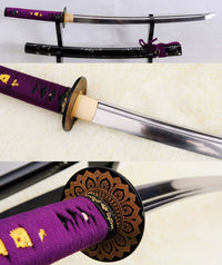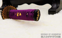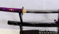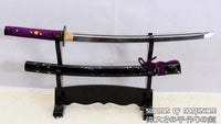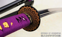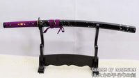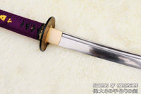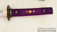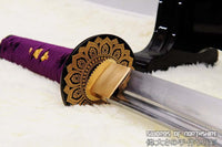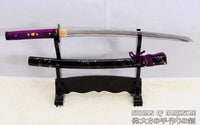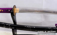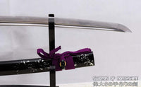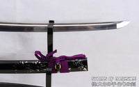 This is a well-made folded steel Katana, following the traditional Japanese process. The blade is very sharp and folded 13 times resulting in over 8,000 layers. It comes with a black lacquered and painted hard wood saya, silk sageo/ito, iron fittings, and multi-colored genuine same (rayskin). The tang is secured into the handle with two bamboo mekugi and features a hand engraved Mei(signature). It is a very good choice for Dojo students, gifts, cutting practice, and display. It is durable enough for cutting tameshigiri and bamboo. Each sword is individually handmade so specifications vary slightly from sword to sword.