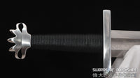 This is a fully functional replica of a Medieval European double-edged viking sword, the blade is full tang and hand sharpened. The high carbon steel blade is made of 13 times folded 1095 steel, with clearly visible beautiful folding grain patterns. The handguard and pommel are made of high quality iron, and the hardwood handle is wrapped with synthetic black leather.