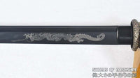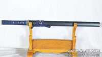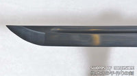 This is a well-made colorful folded steel sword, following the traditional Japanese process. The blade is very sharp and folded 13 times resulting in over 8,000 layers. After sharpening, the blade is etched with an oxidation process to give the surface it's black color. It comes with a black matte hard wood saya and silk sageo/ito, brass fittings, and genuine same (rayskin). The tang is secured into the handle with two bamboo mekugi. It is a very good choice for Dojo students, gifts, cutting practice, and display. It is durable enough for cutting tameshigiri and bamboo. Each sword is individually handmade so specifications vary slightly from sword to sword.
