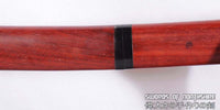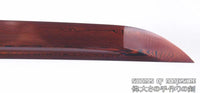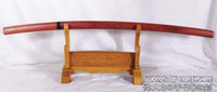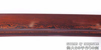 This is a well-made colorful folded steel sword, following the traditional Japanese process. The blade is very sharp and folded 13 times resulting in over 8,000 layers. After sharpening, the blade is etched with an oxidation process to give the surface it's black and red color. It comes with a african rosewood saya with buffalo horn and matching handle. The tang is secured into the handle with two bamboo mekugi. It is a very good choice for Dojo students, gifts, cutting practice, and display. It is durable enough for cutting tameshigiri and bamboo. Each sword is individually handmade so specifications vary slightly from sword to sword.