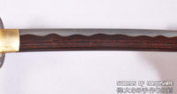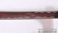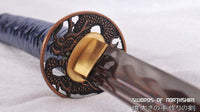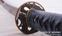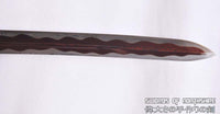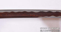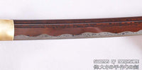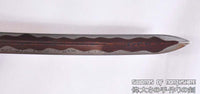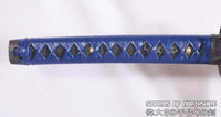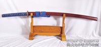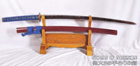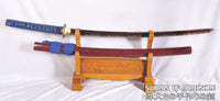 This is a well-made colorful folded steel sword in unokubi-zukuri style, with two cutting edges. The blade is very sharp and folded 13 times resulting in over 8,000 layers. After sharpening, the blade is etched with an oxidation process to give the surface it's black and red color. It comes with a hardwood saya with crackle design, blue leather ito, silk sageo, solid alloy fittings, and genuine same (rayskin). The tang is secured into the handle with two bamboo mekugi. It is a very good choice for Dojo students, gifts, cutting practice, and display. It is durable enough for cutting tameshigiri and bamboo. Each sword is individually handmade so specifications vary slightly from sword to sword.