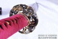 This is a well-made folded steel samurai sword set, following the traditional Japanese process. The blades are very sharp and folded 13 times resulting in over 8,000 layers. After sharpening, the blade is etched with an oxidation process to give the surface it's black and red color. They come with a dark red lacquered saya, silk sageo/ito, premium copper fittings, and genuine same (rayskin). The tang is secured into the handle with two bamboo mekugi. It is a very good choice for Dojo students, gifts, cutting practice, and display. They are durable enough for cutting tameshigiri and bamboo. Each sword is individually handmade so specifications vary slightly from sword to sword.