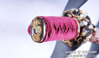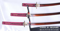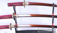 This is a well-made folded steel samurai sword set, following the traditional Japanese process. The blades are very sharp and folded 13 times resulting in over 8,000 layers. After sharpening, the blade is etched with an oxidation process to give the surface it's black and red color. They come with a dark red lacquered saya, silk sageo/ito, premium copper fittings, and genuine same (rayskin). The tang is secured into the handle with two bamboo mekugi. It is a very good choice for Dojo students, gifts, cutting practice, and display. They are durable enough for cutting tameshigiri and bamboo. Each sword is individually handmade so specifications vary slightly from sword to sword.