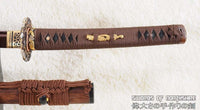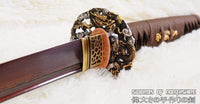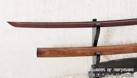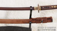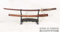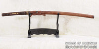 This is a well-made colorful folded steel sword, following the traditional Japanese process. The blade is very sharp and folded 13 times resulting in over 8,000 layers. After sharpening, the blade is etched with an oxidation process to give the surface it's black and red color. It comes with a huali wood saya with buffalo horn, silk sageo/ito, copper fittings, and genuine same (rayskin). The tang is secured into the handle with two bamboo mekugi. It is a very good choice for Dojo students, gifts, cutting practice, and display. It is durable enough for cutting tameshigiri and bamboo. Each sword is individually handmade so specifications vary slightly from sword to sword.