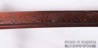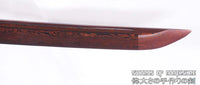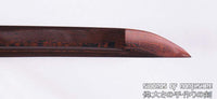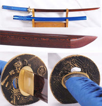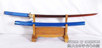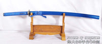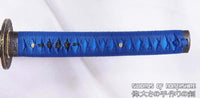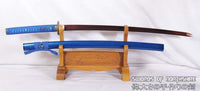 This is a well-made colorful folded steel sword, following the traditional Japanese process. The blade is very sharp and folded 13 times resulting in over 8,000 layers. After the sharpening work, the blade is specially treated to show the unique and beautiful color. There are three different colors: black, red, and black & red. It comes with a blue lacquered hardwood saya with buffalo horn, silk sageo/ito, brass and alloy fittings, and genuine same (rayskin). The tang is secured into the handle with two bamboo mekugi. It is a very good choice for Dojo students, gifts, cutting practice, and display. It is durable enough for cutting tameshigiri and bamboo. The colorful film is very solid; it will not come off. Each sword is individually handmade so specifications vary slightly from sword to sword.