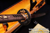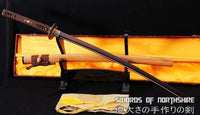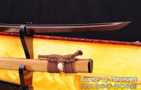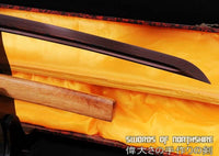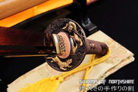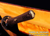 This is a well-made colorful folded steel sword, following the traditional Japanese process. The blade is very sharp and folded 14 times resulting in over 16,000 layers. After sharpening, the blade is etched with an oxidation process to give the surface it's black and red color. It comes with a natural hard wood saya with buffalo horn koiguchi, tiger themed copper fittings, and genuine same (rayskin). The tang is secured into the handle with two bamboo mekugi. It is a very good choice for Dojo students, gifts, cutting practice, and display. It is durable enough for cutting tameshigiri and bamboo. Each sword is individually handmade so specifications vary slightly from sword to sword.