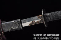 This battle ready dao sword is made of folded steel, designed to be perfect for practical Chinese martial arts training. The blade is heat-treated, tempered, and oil quenched to achieve optimal levels of durability and hardness. The blade is thick, powerful, and full tang. Traditional design with modern construction, this is not your average wushu sword. It is a weighty sword with a hand sharpened edge for practical use, or for serious collectors and Chinese history enthusiasts. It comes with a full rayskin wrapped scabbard and handle, and high quality engraved iron fittings. The full tang is secured into the handle with two bamboo pegs. The sword is great for tai chi, kung fu, wushu, cutting practice, and display. It's durable enough for tameshigiri and bamboo. Each sword is individually handmade so specifications vary slightly from sword to sword.
