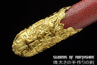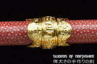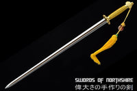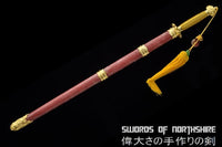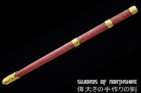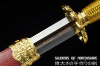 This battle ready Jian sword is made of folded steel, designed to be perfect for practical Chinese martial arts training. The blade is heat-treated, tempered, and oil quenched to achieve optimal levels of durability and hardness. Traditional design with modern construction, this is not your average wushu sword. It is a weighty sword with a hand sharpened edge for practical use, or for serious collectors and Chinese history enthusiasts. It comes with a full rayskin wrapped lacquer scabbard, silk wrapped handle, and high qualtiy copper fittings plated in real gold. The sword is great for tai chi, kung fu, wushu, cutting practice, and display. It's durable enough for tameshigiri and bamboo. Each sword is individually handmade so specifications vary slightly from sword to sword.
