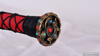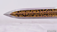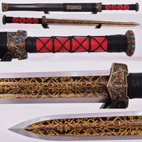 This battle ready Jian sword is made of folded steel with an etched pattern to resemble the Sword of Goujian. The middle portion of the blade is engraved and painted with a mixture of laquer and gold-colored powder to give it an elegant and striking design. The sword is made to be perfect for practical Chinese martial arts training. The blade is heat-treated, tempered, and oil quenched to achieve optimal levels of durability and hardness. Traditional design with modern construction, this is not your average wushu sword. It is a weighty sword with a hand sharpened edge for practical use, or for serious collectors and Chinese history enthusiasts. It comes with an ebony wood scabbard, matching handle, and high quality brass fittings with inlaid gems. The sword is great for tai chi, kung fu, wushu, cutting practice, and display. It's durable enough for tameshigiri and bamboo. Each sword is individually handmade so specifications vary slightly from sword to sword.