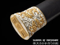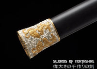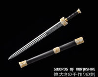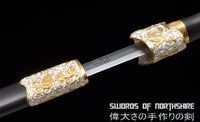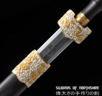 This sword is a functional replica of the King of Yue Goujian Sword, from the Yue Dynasty (B.C 2032-B.C110) with gold and silver plated fittings. The blade is heat-treated, tempered, and oil quenched to achieve optimal levels of durability and hardness. Traditional design with modern construction, this is not your average wushu sword. It is a weighty sword with a hand sharpened edge for practical use, or for serious collectors and Chinese history enthusiasts. It comes with an ebony wood scabbard, matching handle, and high quality engraved copper fittings plated with real gold and silver. The sword is great for tai chi, kung fu, wushu, cutting practice, and display. It's durable enough for tameshigiri and bamboo. Each sword is individually handmade so specifications vary slightly from sword to sword.