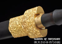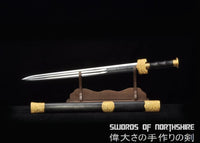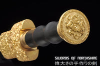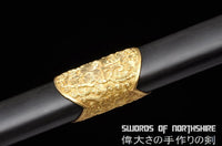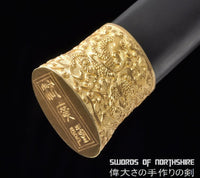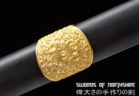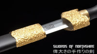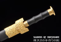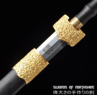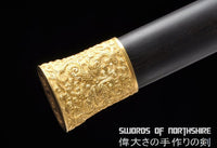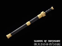 This sword is a functional replica of the King of Yue Goujian Sword, from the Yue Dynasty (B.C 2032-B.C110) with gold plated fittings. The blade is heat-treated, tempered, and oil quenched to achieve optimal levels of durability and hardness. Traditional design with modern construction, this is not your average wushu sword. It is a weighty sword with a hand sharpened edge for practical use, or for serious collectors and Chinese history enthusiasts. It comes with an ebony wood scabbard, matching handle, and high quality engraved copper fittings plated with real gold. The sword is great for tai chi, kung fu, wushu, cutting practice, and display. It's durable enough for tameshigiri and bamboo. Each sword is individually handmade so specifications vary slightly from sword to sword.