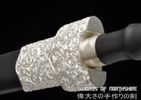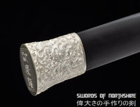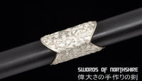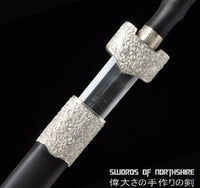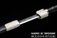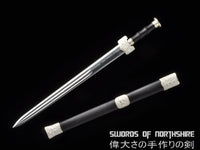 This sword is a functional replica of the King of Yue Goujian Sword, from the Yue Dynasty (B.C 2032-B.C110) with silver plated fittings. The blade is heat-treated, tempered, and oil quenched to achieve optimal levels of durability and hardness. Traditional design with modern construction, this is not your average wushu sword. It is a weighty sword with a hand sharpened edge for practical use, or for serious collectors and Chinese history enthusiasts. It comes with an ebony wood scabbard, matching handle, and high quality engraved copper fittings plated with silver. The sword is great for tai chi, kung fu, wushu, cutting practice, and display. It's durable enough for tameshigiri and bamboo. Each sword is individually handmade so specifications vary slightly from sword to sword.