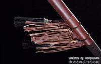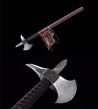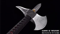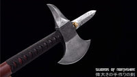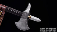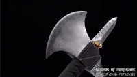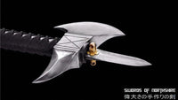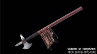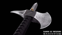 This battle axe features a unique ito wrapping near the blade, complemented by a long handle of leather to provide a good grip to the wielder. The blade is made with a beautiful wavy grain pattern from the folding of the steel, along with a hook on the backside of the head that can be used on the backswing to great effect. Finally, a small blade rests upon the tip of the head, made to puncture or spear targets. With each of these points in mind, this axe is truly a well rounded, multi-purpose piece.