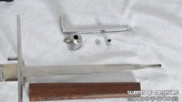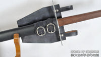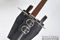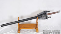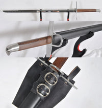 Lovingly dubbed the "Falmessertana" this unique Messer sword is a fully functional, yet affordable back yard cutter. Borrowing from several popular designs, this sword combines the cutting ability of the katana with the superior balance of a European bastard sword. The desire when producing this sword was to have an affordable, durable blade capable of performing not just as a chopper, but to perform technical cuts as well. Form follows function in this design, with a very sharp edge, as well as a false edge running 9" along the back of the blade. The combination of a distal taper and a half fuller bring the balance very close to the hand and makes this sword feel light and agile. Many long sword techniques (as well as true messer techniques) use the guard as a vital part of the arsenal. The one piece guard draws from the Messer style ring guard. It is simple, yet highly functional providing optimal protection for the hand.