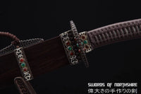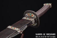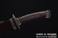 This battle ready dao sword is made of clay tempered & folded high carbon steel with fine hazuya polishing, designed to be perfect for practical Chinese martial arts training. The blade is heat-treated, tempered, and quenched to achieve optimal levels of durability and hardness. The blade is thick, powerful, and full tang. Traditional design with modern construction, this is not your average wushu sword. It is a weighty sword with a hand sharpened edge for practical use, or for serious collectors and Chinese history enthusiasts. It comes with a high-density ebony wood scabbard, silk wrapped handle, and beautiful hand carved copper fittings with inlaid jade gems. The sword is great for tai chi, kung fu, wushu, cutting practice, and display. It's durable enough for tameshigiri and bamboo. Each sword is fully handmade from the ground up, no two swords will be exactly alike.