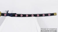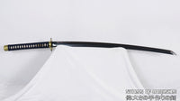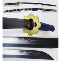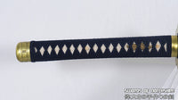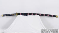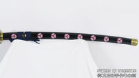 The Zoro sword comes with a black lacquered hard wood saya with custom paintings, dark blue silk ito, and high quality brass fittings. The tang of the sword is secured into the handle with two bamboo mekugi and features a hand engraved Mei (signature). These One Piece Zoro swords are a very good choice for Dojo students, gifts, cutting practice, and display. When it comes to our Zoro katanas, each of our Zoro One Piece swords is durable enough for cutting tameshigiri and bamboo. Every one of our Zoro Roronoa swords is individually handmade, so specifications vary slightly from sword to sword.