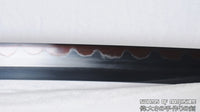 The visible undulating grain pattern on the blade of the Zoro sword Shusui replica is a result from folding the steel 13 times during forging. The blade of the Shusui sword One Piece replica is repeatedly heat treated and hand forged to remove impurities, and the blade is treated with an oxidation process that makes the spine black with a red cutting edge. The clay temper process for the Zoro sword combines the characters of toughness and flexibility and results in a genuine hamon (temper line).