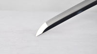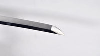 This is a well-made folded steel Katana, made to look just like Roronoa Zoro's Wado Ichimonji Sword from One Piece. The blade is very sharp and designed with a unique black spine coloring. It comes with a white lacquered hard wood saya, silk ito, brass fittings, and genuine same'gawa (rayskin). The tang is secured into the handle with two bamboo mekugi and features a hand engraved Mei(signature). It is a very good choice for Dojo students, gifts, cutting practice, and display. It is durable enough for cutting tameshigiri and bamboo. Each Zoro Roronoa sword is individually handmade so specifications vary slightly from sword to sword.