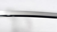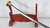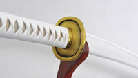 This is a well-made folded steel Katana, made to look just like Roronoa Zoro's Wado Ichimonji Sword from One Piece. The blade is very sharp and designed with a unique black spine coloring. It comes with a white lacquered hard wood saya, silk ito, brass fittings, and genuine same'gawa (rayskin). The tang is secured into the handle with two bamboo mekugi and features a hand engraved Mei(signature). It is a very good choice for Dojo students, gifts, cutting practice, and display. It is durable enough for cutting tameshigiri and bamboo. Each Zoro Roronoa sword is individually handmade so specifications vary slightly from sword to sword.
