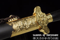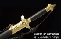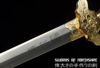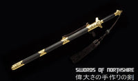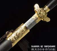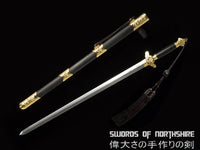 This battle ready Jian sword is made of folded steel, designed to be perfect for practical Chinese martial arts training. The blade is heat-treated, tempered, and oil quenched to achieve optimal levels of durability and hardness. Traditional design with modern construction, this is not your average wushu sword. It is a weighty sword with a hand sharpened edge for practical use, or for serious collectors and Chinese history enthusiasts. It comes with an ebony wood scabbard, matching handle, and high quality copper fittings plated with real gold. The sword is great for tai chi, kung fu, wushu, cutting practice, and display. It's durable enough for tameshigiri and bamboo. Each sword is individually handmade so specifications vary slightly from sword to sword.