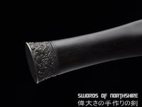 This battle ready Jian short sword is made of folded steel, designed to be perfect for practical Chinese martial arts training. The blade is heat-treated, tempered, and oil quenched to achieve optimal levels of durability and hardness. Traditional design with modern construction, this is not your average wushu sword. It is a solid sword with a hand sharpened edge for practical use, or for serious collectors and Chinese history enthusiasts. It comes with an ebony wood scabbard and high quality engraved iron fittings. The sword is great for tai chi, kung fu, wushu, cutting practice, and display. It's durable enough for tameshigiri and bamboo. Each sword is individually handmade so specifications vary slightly from sword to sword.
