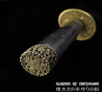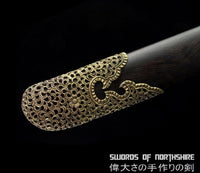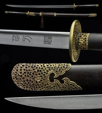 This battle ready Miao Dao sword is made of folded steel, designed to be perfect for practical Chinese martial arts training. The blade is heat-treated, tempered, and oil quenched to achieve optimal levels of durability and hardness. The blade is thick, powerful, and full tang. Traditional design with modern construction, this is not your average wushu sword. It is a weighty sword with a hand sharpened edge for practical use, or for serious collectors and Chinese history enthusiasts. It comes with a huali wood scabbard and high quality engraved copper fittings. The full tang is secured into the handle with two bamboo pegs. The sword is great for tai chi, kung fu, wushu, cutting practice, and display. It's durable enough for tameshigiri and bamboo. Each sword is individually handmade so specifications vary slightly from sword to sword.
