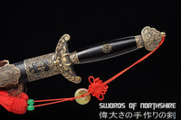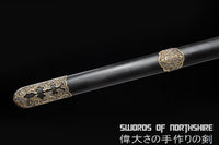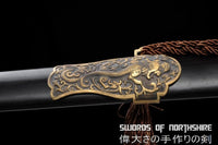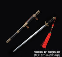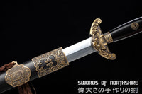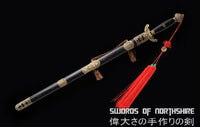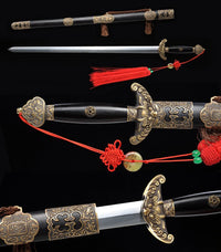This battle ready Jian sword is made of folded steel, designed to be perfect for practical Chinese martial arts training. The blade is heat-treated, tempered, and oil quenched to achieve optimal levels of durability and hardness. Traditional design with modern construction, this is not your average wushu sword. It is a weighty sword with a hand sharpened edge for practical use, or for serious collectors and Chinese history enthusiasts. It comes with an ebony wood scabbard, matching handle, and high quality engraved copper fittings. The sword is great for tai chi, kung fu, wushu, cutting practice, and display. It's durable enough for tameshigiri and bamboo. Each sword is individually handmade so specifications vary slightly from sword to sword.
