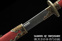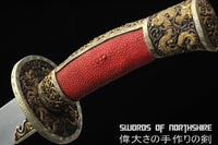 Red Dragon Chinese Sword Clay Tempered & Folded Steel Blade Full Rayskin Wrap Dao Features: