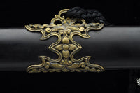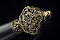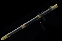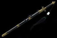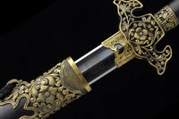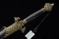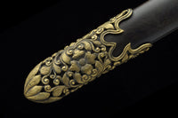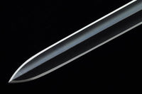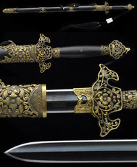This battle ready Jian sword is made of folded steel, designed to be perfect for practical Chinese martial arts training. The blade is heat-treated, tempered, and oil quenched to achieve optimal levels of durability and hardness. Traditional design with modern construction, this is not your average wushu sword. It is a weighty sword with a hand sharpened edge for practical use, or for serious collectors and Chinese history enthusiasts. It comes with an ebony wood scabbard, matching handle, and high quality engraved copper fittings. The sword is great for tai chi, kung fu, wushu, cutting practice, and display. It's durable enough for tameshigiri and bamboo. Each sword is individually handmade so specifications vary slightly from sword to sword.
