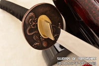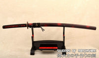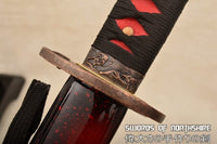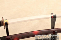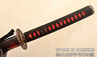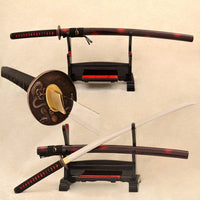 This Katana is made of 9260 Spring Steel which can withstand a high degree of bending and still spring back true. The blade has great durability and also better resistance to abrasion and corrosion than other high carbon steel blades. The blade is full tang and hand sharpened, suitable for battle. The sword comes with silk ito and sageo, genuine rayskin, alloy fittings, painted hardwood saya, and brass habaki and seppa. This sword is a very good choice for dojo and iaido use, gifts, cutting practice, display, and collection. It is durable enough for cutting tatami mats and bamboo. Each sword is fully handmade from the ground up, no two blades will be exactly alike.
