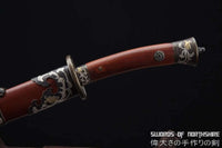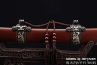This battle ready Rosewood Dragon Dao sword is made of clay tempered & folded high carbon steel with fine hazuya polishing, designed to be perfect for practical Chinese martial arts training. The blade is heat-treated, tempered, and quenched to achieve optimal levels of durability and hardness. The blade is thick, powerful, and full tang. Traditional design with modern construction, this is not your average wushu sword. It is a weighty sword with a hand sharpened edge for practical use, or for serious collectors and Chinese history enthusiasts. It comes with a high quality rosewood scabbard, matching rosewood handle, and beautiful hand carved brass fittings. The sword is great for tai chi, kung fu, wushu, cutting practice, and display. It's durable enough for tameshigiri and bamboo. Each sword is fully handmade from the ground up, no two swords will be exactly alike.