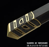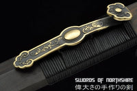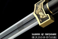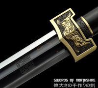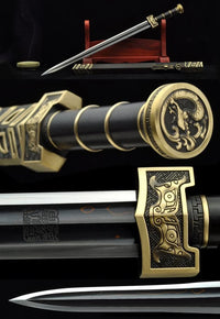This battle ready Han Dynasty Jian sword is made of folded steel, designed to be perfect for practical Chinese martial arts training. The blade is heat-treated, tempered, and oil quenched to achieve optimal levels of durability and hardness. Traditional design with modern construction, this is not your average wushu sword. It is a weighty sword with a hand sharpened edge for practical use, or for serious collectors and Chinese history enthusiasts. It comes with an ebony wood scabbard and high quality engraved copper fittings. The sword is great for tai chi, kung fu, wushu, cutting practice, and display. It's durable enough for tameshigiri and bamboo. Each sword is individually handmade so specifications vary slightly from sword to sword.