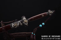 This battle ready Seven Dragon Jian sword is made of folded damascus steel, designed to be perfect for practical Chinese martial arts training. The blade is heat-treated, folded, tempered, and oil quenched to achieve optimal levels of durability and hardness. Traditional design with modern construction, this is not your average wushu sword. It is a weighty sword with a hand sharpened edge for practical use, or for serious collectors and Chinese history enthusiasts. It comes with a high quality rosewood scabbard, matching handle with a beautiful tassel, and high quality carved brass fittings. The sword is great for tai chi, kung fu, wushu, cutting practice, and display. It's durable enough for tameshigiri and bamboo. Each sword is fully handmade from the ground up, no two swords will be exactly alike.
