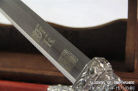 A shortened jian, this sword is perfect for any swordsman looking for a companion blade to their jian or katana. Made from the finest redwood, the saya is a beautiful complement to the tsuka, made of fitted steel painted to match. This shortsword comes with a free personalized engraving, as well as stainless steel to accent the redwood saya. The sword is great for tai chi, kung fu, wushu, cutting practice, and display. It's durable enough for tameshigiri and bamboo. Each sword is individually handmade so specifications vary slightly from sword to sword.