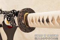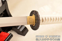 This Katana is made of 9260 Spring Steel which can withstand a high degree of bending and still spring back true. The blade has great durability and also better resistance to abrasion and corrosion than other high carbon steel blades. The blade is full tang and hand sharpened, suitable for battle. The sword comes with silk ito and sageo, genuine rayskin, alloy fittings, painted hardwood saya, and engraved brass habaki. This sword is a very good choice for dojo and iaido use, gifts, cutting practice, display, and collection. It is durable enough for cutting tatami mats and bamboo. Each sword is fully handmade from the ground up, no two blades will be exactly alike.