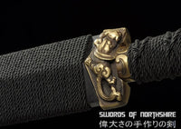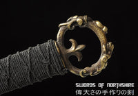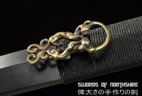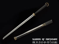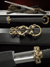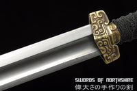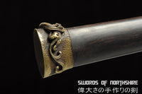 This battle ready dao sword is made of folded steel, designed to be perfect for practical Chinese martial arts training. The blade is heat-treated, tempered, and oil quenched to achieve optimal levels of durability and hardness. The blade is thick, powerful, and full tang. Traditional design with modern construction, this is not your average wushu sword. It is a weighty sword with a hand sharpened edge for practical use, or for serious collectors and Chinese history enthusiasts. It comes with an ebony wood scabbard and high quality engraved copper fittings. The sword is great for tai chi, kung fu, wushu, cutting practice, and display. It's durable enough for tameshigiri and bamboo. Each sword is individually handmade so specifications vary slightly from sword to sword.