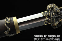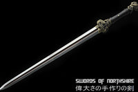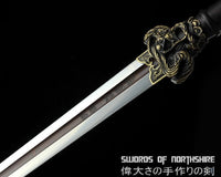 This battle ready Jian sword is made of folded steel, designed to be perfect for practical Chinese martial arts training. The blade is heat-treated, tempered, and oil quenched to achieve optimal levels of durability and hardness. Traditional design with modern construction, this is not your average wushu sword. It is a weighty sword with a hand sharpened edge for practical use, or for serious collectors and Chinese history enthusiasts. It comes with an ebony wood scabbard, matching handle, and beautiful high quality copper fittings. The sword is great for tai chi, kung fu, wushu, cutting practice, and display. It's durable enough for tameshigiri and bamboo. Each sword is individually handmade so specifications vary slightly from sword to sword.