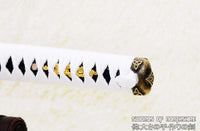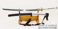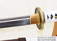 This is a well-made folded steel sword, made to look just like Michonne's Katana from The Walking Dead. The blade is very sharp and folded 13 times resulting in over 8,000 layers. It comes with a leather wrapped hardwood saya with shoulder strap, silk sageo/ito, premium brass fittings, and genuine same (rayskin). The tang is secured into the handle with two bamboo mekugi and features a hand engraved Mei(signature). It is a very good choice for Dojo students, gifts, cutting practice, and display. It is durable enough for cutting tameshigiri and bamboo. Each sword is individually handmade so specifications vary slightly from sword to sword.