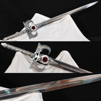 Are you tired of the cheap mold-made stainless steel replica swords? Are you looking for a real handmade fully functional sword? This Thundercats Sword of Omens is a very sharp and strong fully functional replica. The full-tang blade is made of 1095 high carbon steel, designed for heavy duty cutting. It can cut through bone, thick bamboo, copper, and iron wire without damaging the cutting edge. The surface is well-polished. The handle, handguard, and pommel are made of iron. It is a piece of graceful handmade art.