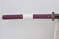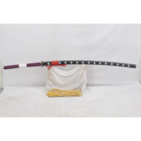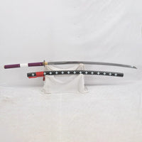 Laws sword comes equipped with a black lacquered and painted hardwood saya, silk sageo/ito, brass and alloy fittings, genuine same' (rayskin) and silk wrapped tsuka (handle). The Nodachi is well assembled and the ito wrapping is tight and even. Each One Piece Law sword is individually handmade so specifications may vary slightly.