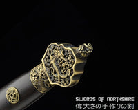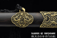 This battle ready Jian sword is made of folded steel, designed to be perfect for practical Chinese martial arts training. The blade is heat-treated, tempered, and oil quenched to achieve optimal levels of durability and hardness. Traditional design with modern construction, this is not your average wushu sword. It is a solid sword with a hand sharpened edge for practical use, or for serious collectors and Chinese history enthusiasts. It comes with an ebony wood scabbard, matching handle, and high quality engraved copper fittings. The sword is great for tai chi, kung fu, wushu, cutting practice, and display. It's durable enough for tameshigiri and bamboo. Each sword is individually handmade so specifications vary slightly from sword to sword.