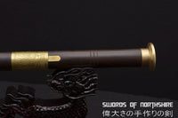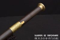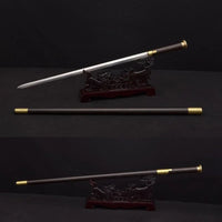This battle ready Jian sword is made of folded steel, designed to act as a walking cane. The blade is heat-treated, tempered, and oil quenched to achieve optimal levels of durability and hardness. When the sword is locked, it's a walking stick. The handle and cane(scabbard) are made of ebony, a type of high-density wood with fine texture. There's a non-slip fitting at the end of stick. Pushing the button on the handle unlocks the sword, releasing the scabbard. The blade is made of folded steel, with a clearly visible grain pattern. The lock and fittings are made of brass. The patterns on the adornments of the scabbard are hand-engraved. The length can be customized according to the user's height. Each sword is individually handmade so specifications vary slightly from sword to sword.