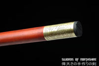 This battle ready Jian sword is made of folded steel, designed to act as a walking cane. The blade is heat-treated, tempered, and oil quenched to achieve optimal levels of durability and hardness. When the sword is locked, it's a walking stick. The handle and cane(scabbard) are made of rosewood. There's a non-slip fitting at the end of stick. Pushing the button on the handle unlocks the sword, releasing the scabbard. The blade is made of folded steel, with a clearly visible grain pattern. The lock and fittings are made of brass. The patterns on the adornments of the scabbard are hand-engraved. The length can be customized according to the user's height. Each sword is individually handmade so specifications vary slightly from sword to sword.
