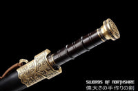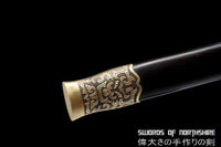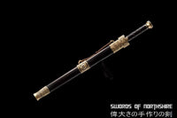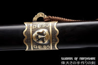 This battle ready Jian sword is made of folded steel, designed to be perfect for practical Chinese martial arts training. The blade is heat-treated, folded, tempered, and oil quenched to achieve optimal levels of durability and hardness. Traditional design with modern construction, this is not your average wushu sword. It is a weighty sword with a hand sharpened edge for practical use, or for serious collectors and Chinese history enthusiasts. It comes with a high quality ebony wood scabbard, matching handle, and high quality engraved brass fittings. The sword is great for tai chi, kung fu, wushu, cutting practice, and display. It's durable enough for tameshigiri and bamboo. Each sword is individually handmade so specifications vary slightly from sword to sword.