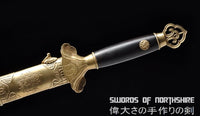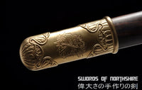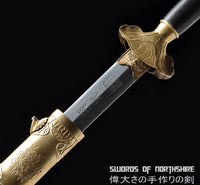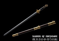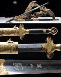 This battle ready Jian sword is made of folded steel, designed to be perfect for practical Chinese martial arts training. The blade is heat-treated, tempered, and oil quenched to achieve optimal levels of durability and hardness. Traditional design with modern construction, this is not your average wushu sword. It is a weighty sword with a hand sharpened edge for practical use, or for serious collectors and Chinese history enthusiasts. It comes with an ebony wood scabbard, matching handle, and high quality engraved copper fittings. The sword is great for tai chi, kung fu, wushu, cutting practice, and display. It's durable enough for tameshigiri and bamboo. Each sword is individually handmade so specifications vary slightly from sword to sword.