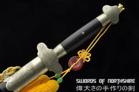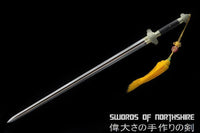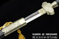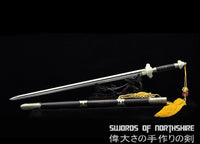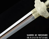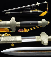 This battle ready Jian sword is made of folded steel, designed to be perfect for practical Chinese martial arts training. The blade is heat-treated, tempered, and oil quenched to achieve optimal levels of durability and hardness. Traditional design with modern construction, this is not your average wushu sword. It is a weighty sword with a hand sharpened edge for practical use, or for serious collectors and Chinese history enthusiasts. It comes with an ebony wood scabbard, matching handle, and high quality white copper fittings. The sword is great for tai chi, kung fu, wushu, cutting practice, and display. It's durable enough for tameshigiri and bamboo. Each sword is individually handmade so specifications vary slightly from sword to sword.