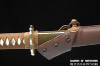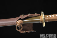 Because we make this Japanese sword from WW2 to replicate every part of the standard issue military weapon, there is no room for customization here other than the optional engraving and sharpening. Every one of these swords has a clay tempered blade, light brown handle wrap, and hardwood saya that’s wrapped in dark brown leather.