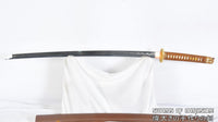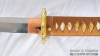 This is an accurate and fully functional reproduction of a WW2 Gunto Japanese Officer Sword, clay tempered with a polished mirror-like surface. It is a very strong sword made with traditional methods, for multiple applications. The blade is repeatedly heat treated and hand forged to remove impurities. The clay temper process combines the characters of toughness and flexibility and results in a genuine hamon (temper line). The blade is full tang and hand sharpened, suitable for battle. The sword comes with a scabbard made of iron and hardwood, brown leather scabbard cover, silk sageo/ito, genuine same' (rayskin), and premium engraved copper fittings with a functional lock mechanism with button release for the scabbard. This sword is a very good choice for dojo and iaido use, gifts, cutting practice, display, and collection. It is durable enough for tameshigiri, bamboo, bones, iron wire, etc. Each sword is fully handmade from the ground up, no two blades will be exactly alike.