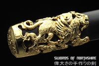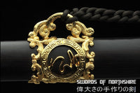 In 2008, the Chinese Ambassador in Oman presented a Xuan Wu Sword to Qabus Bin Said, the King of Oman. The sword was made by Master Shen Xinpei. The fitings are hand-carved, made of copper and plated with real gold. The handguard features a Yin and Yang design. The fittings are based on the four gods. Four Gods are the mythological creatures in the Chinese constellations. They are the Azure Dragon (Qing Long) of the East, the Vermilion Bird (Zhu Que) of the South, the White Tiger (Bai Hu) of the West, and the Black Turtle (Xuan Wu) of the North. Each one of them represents a direction and a season. Xuan Wu is a turtle entwined together with a snake. In ancient China, the tortoise and the snake were thought to be spiritual creatures symbolizing longevity